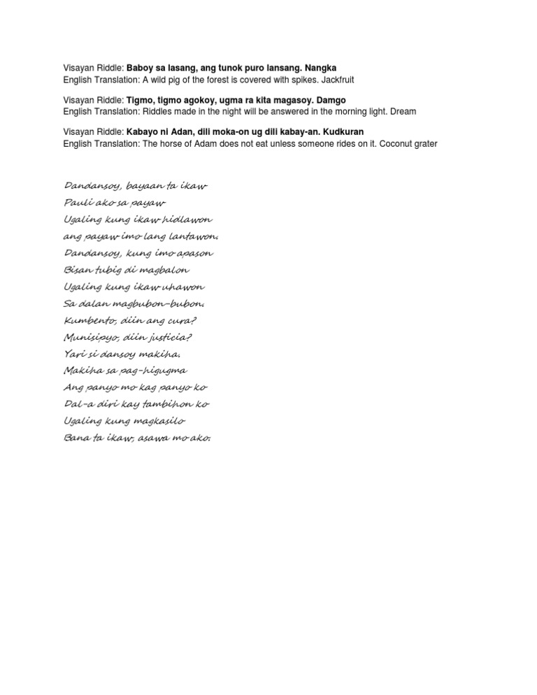 Gaw wierd cagula shunga bisaya ilocano mandaya english visayan. Here we present a small collection of riddles both in Cebuano and English. The answer to this riddle is egg.